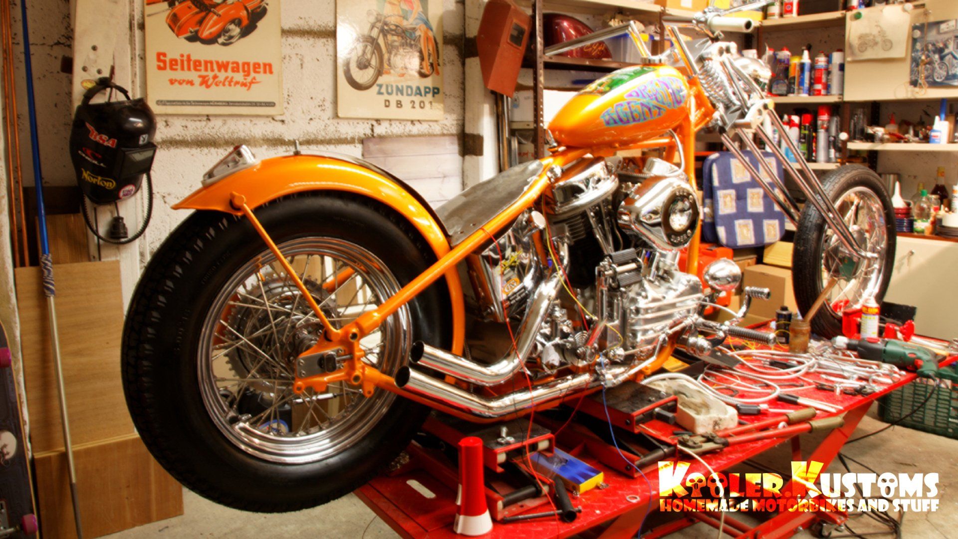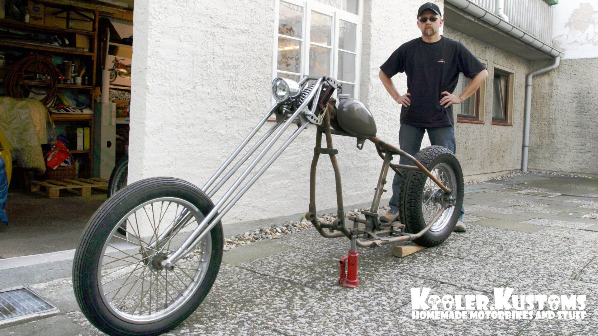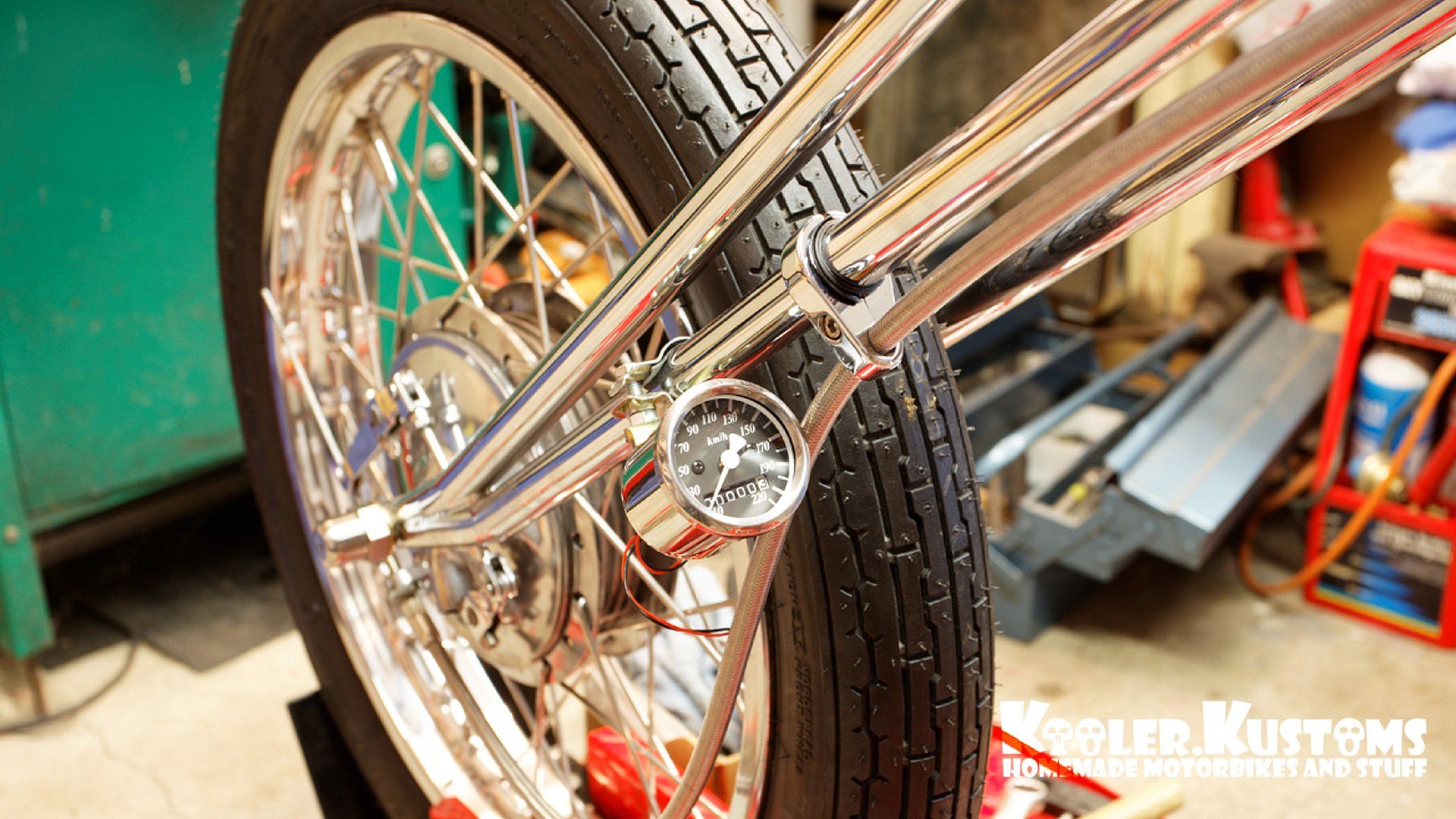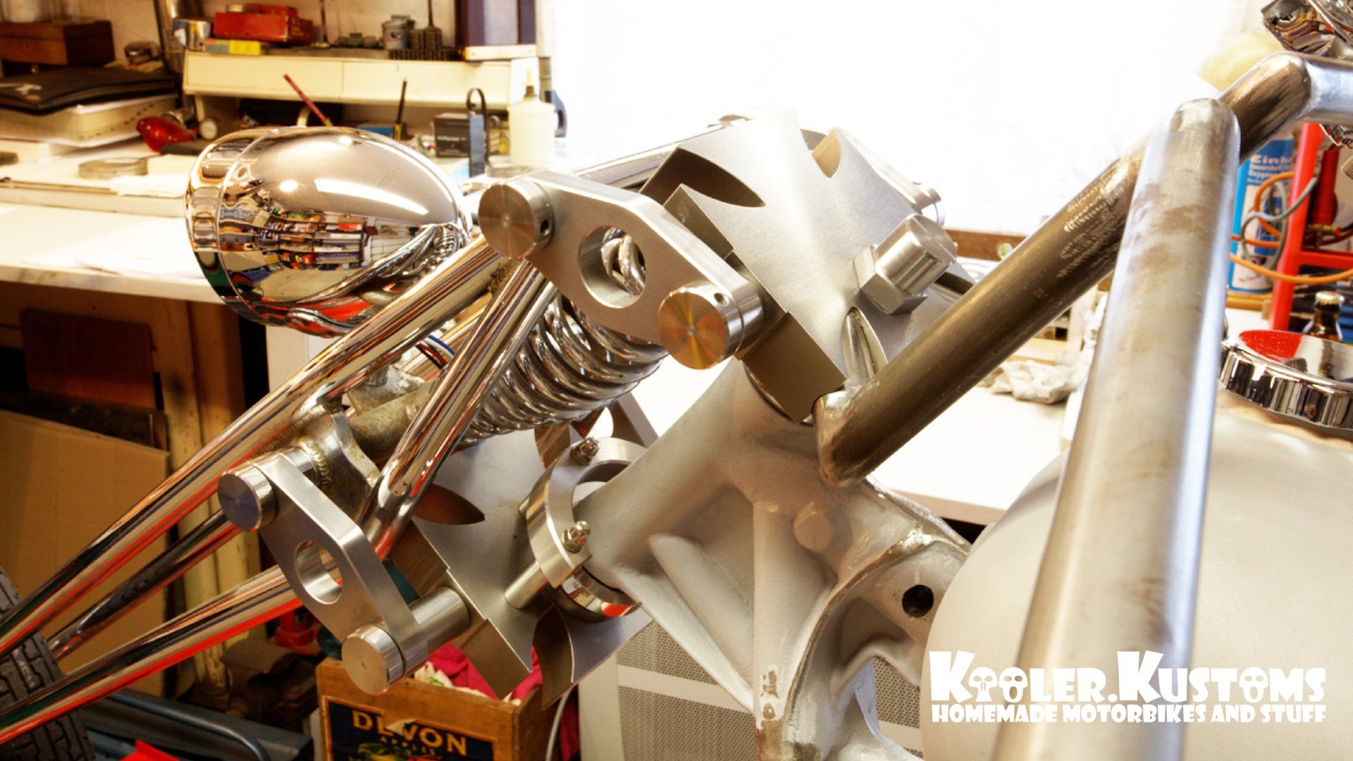 Basis: Eine für nen Paintjob eingetauschte, ranzige CCW –Girdergabel aus den USA. Die Gabel ist neu verchromt und mit CNC-Teilen und drahterodierten Brücken verfeinert.