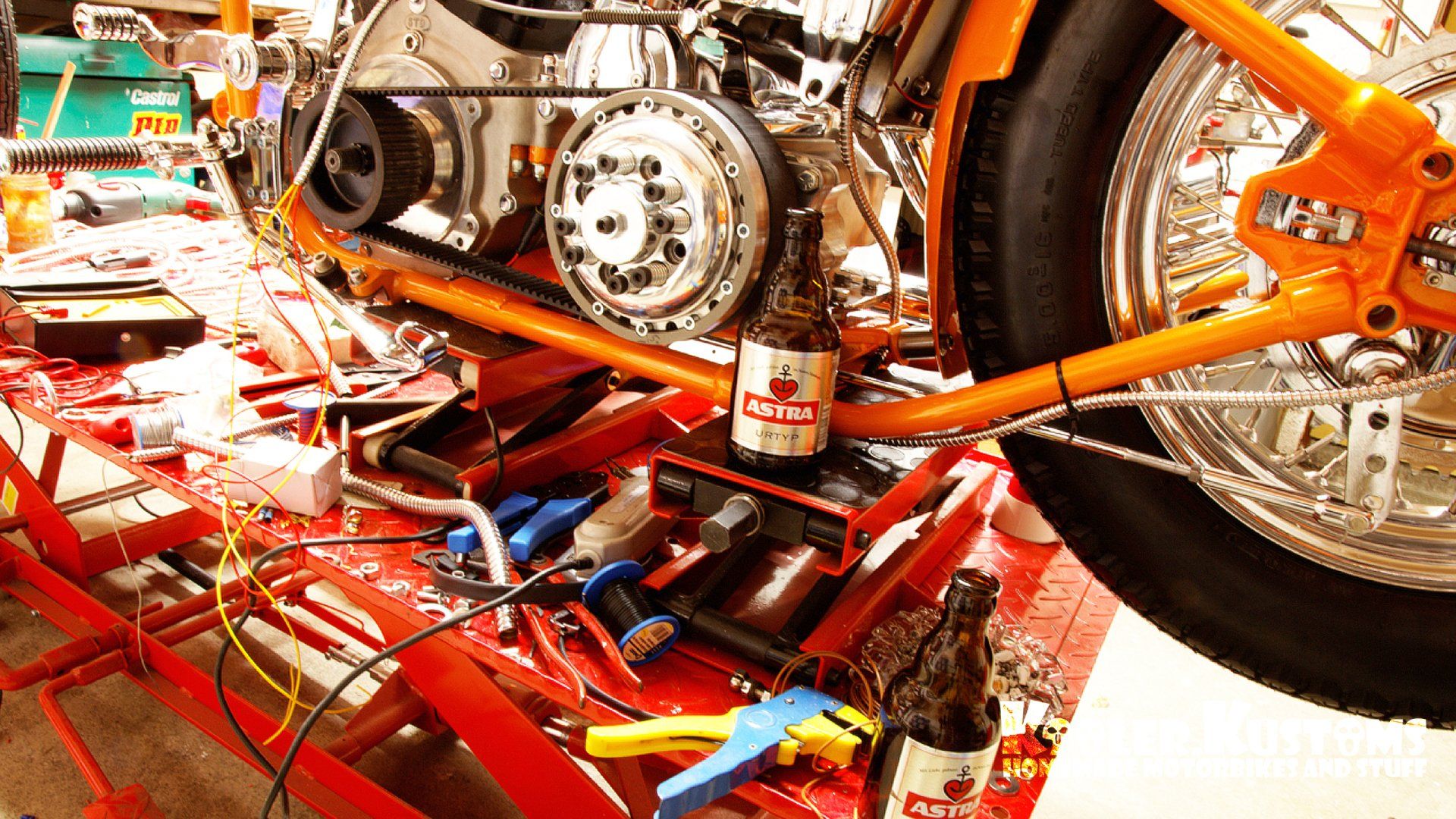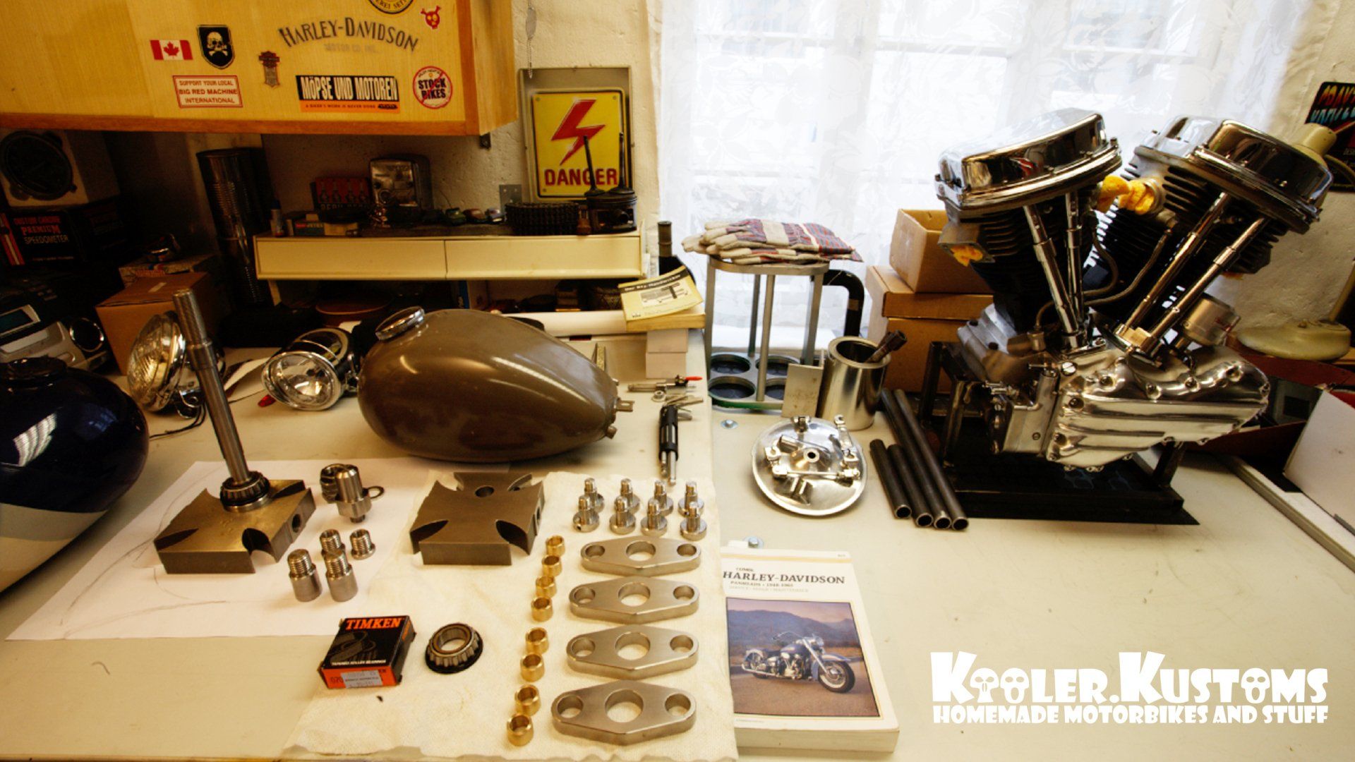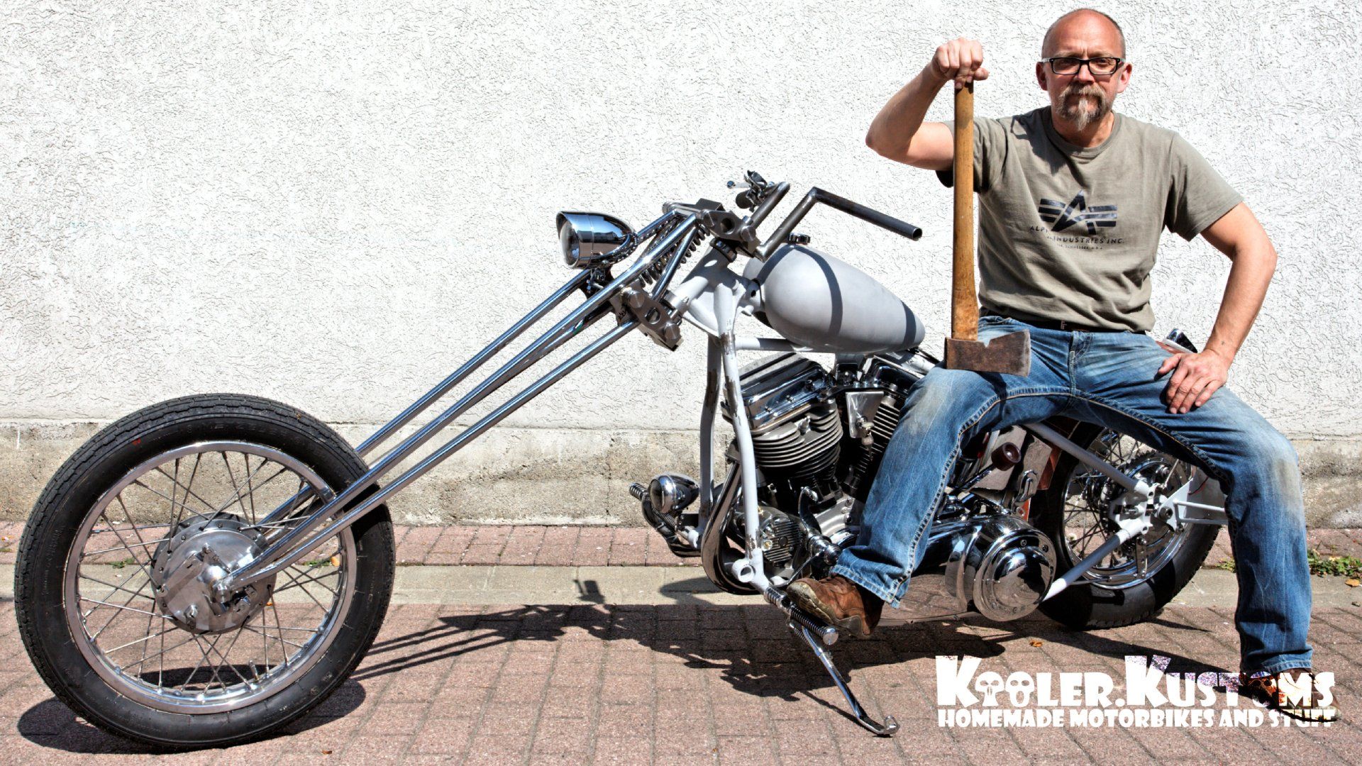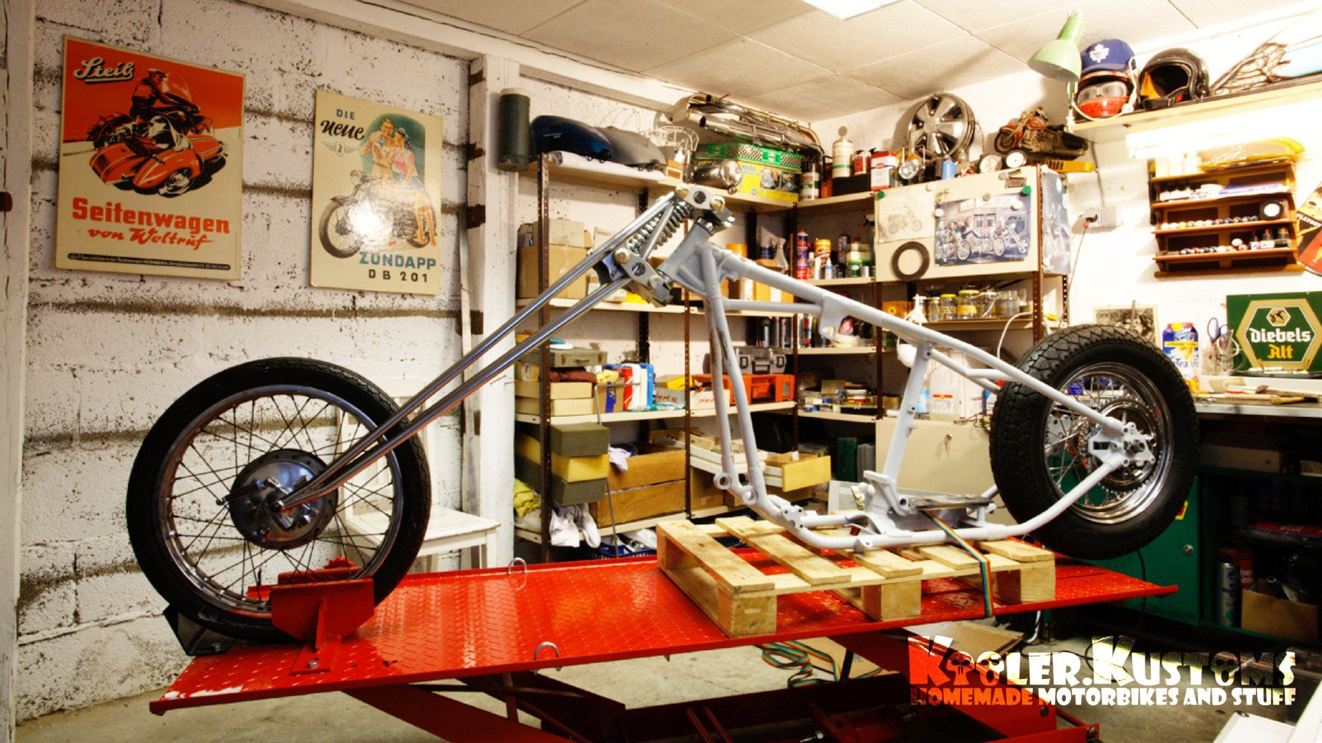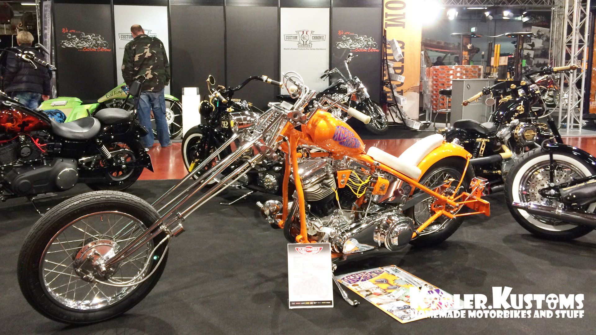 Basis: Eine für nen Paintjob eingetauschte, ranzige CCW –Girdergabel aus den USA. Die Gabel ist neu verchromt und mit CNC-Teilen und drahterodierten Brücken verfeinert.