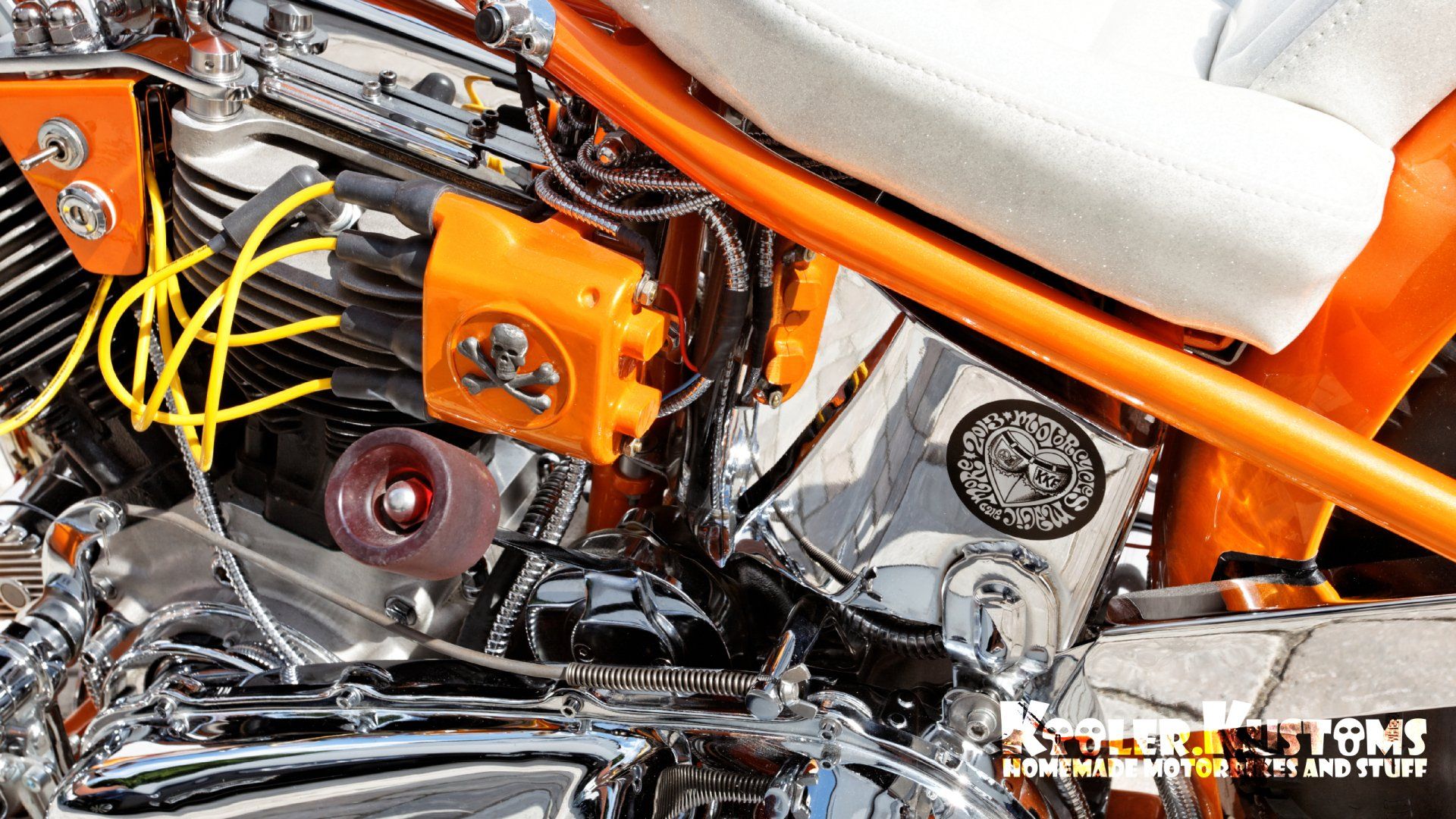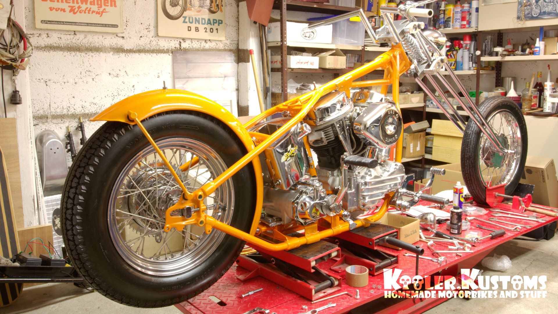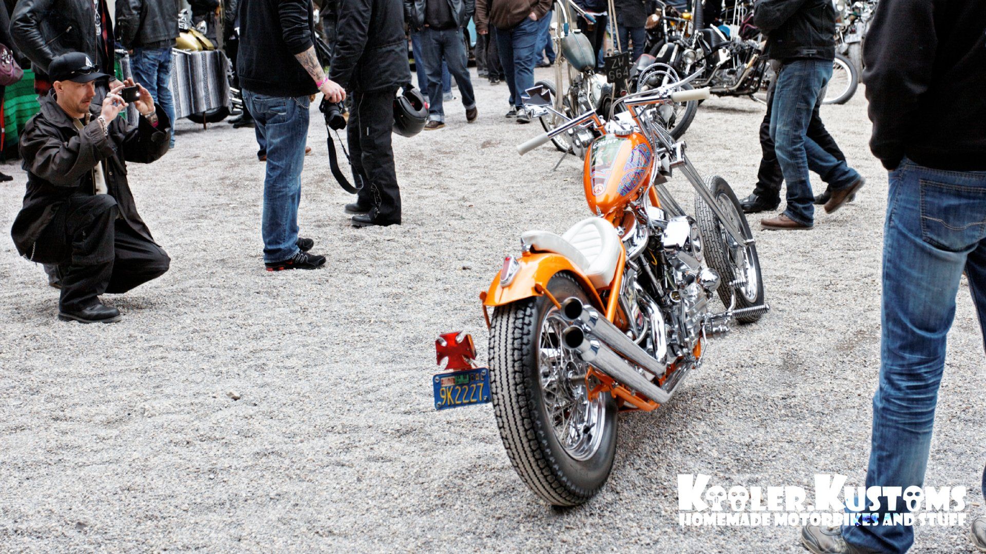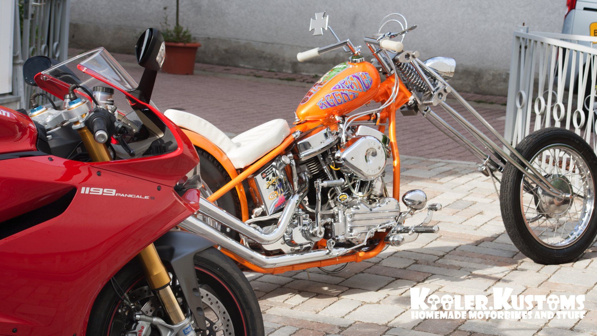 Basis: Eine für nen Paintjob eingetauschte, ranzige CCW –Girdergabel aus den USA. Die Gabel ist neu verchromt und mit CNC-Teilen und drahterodierten Brücken verfeinert.