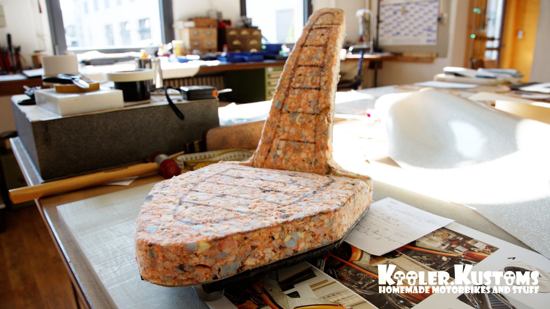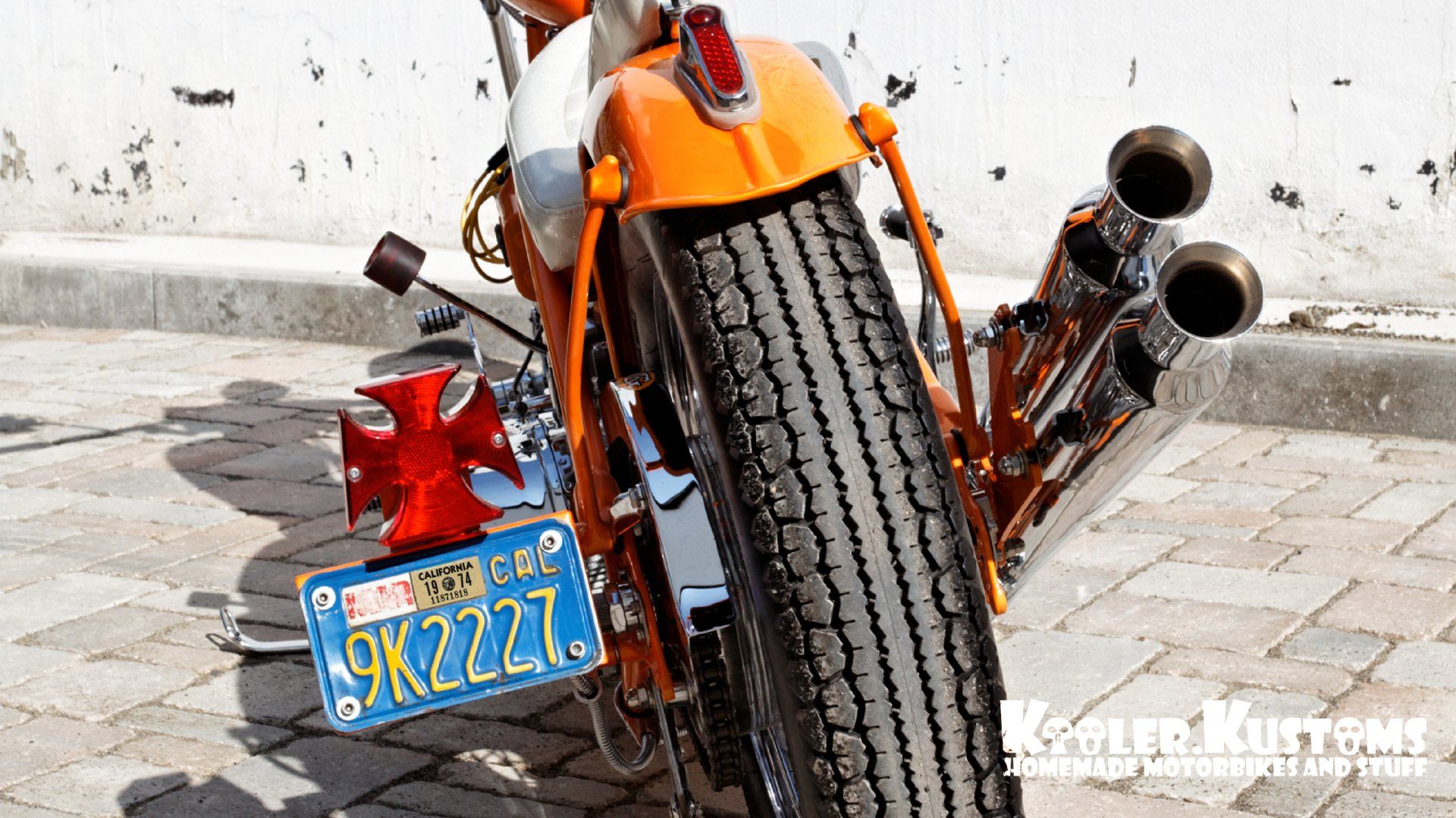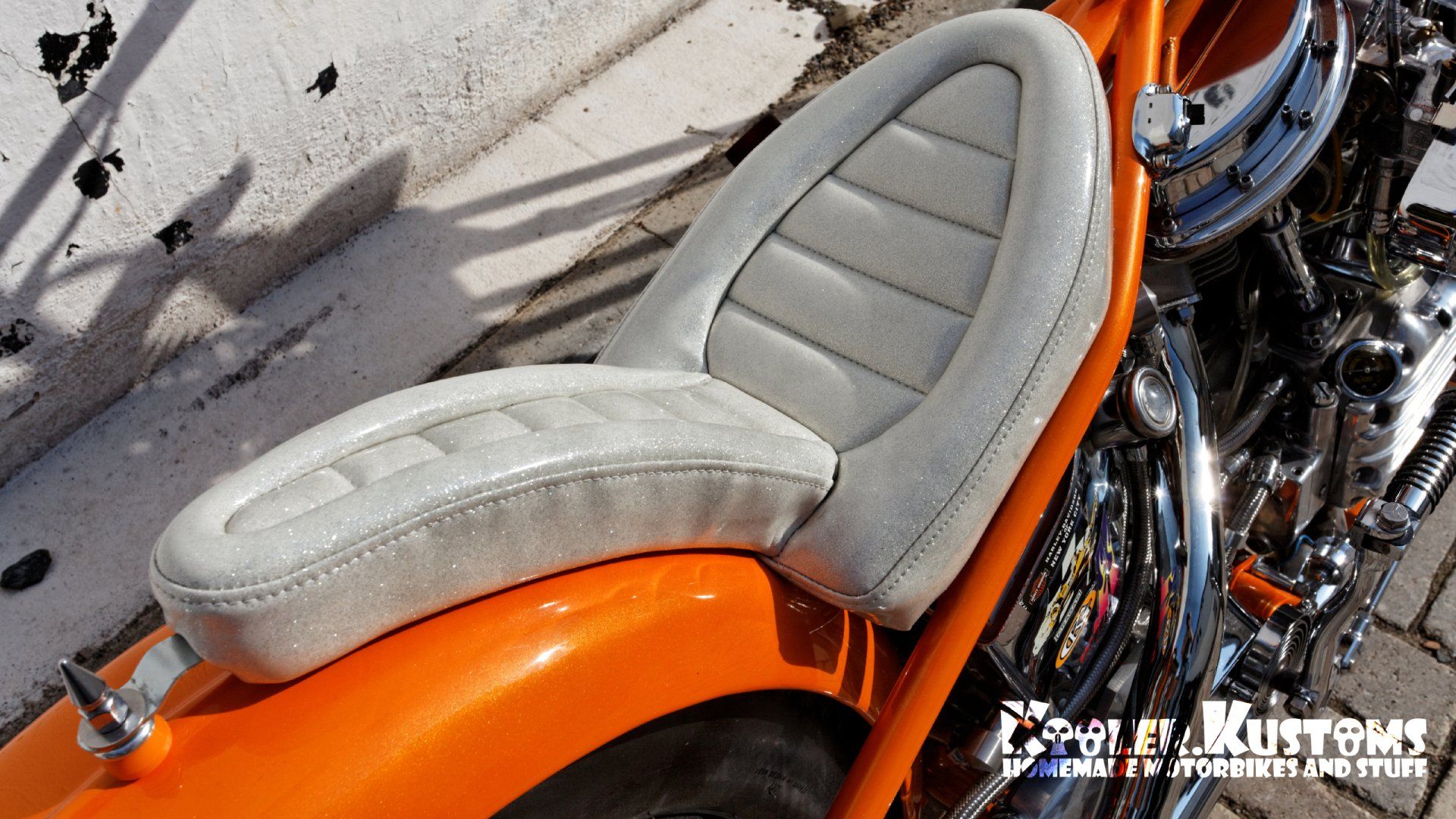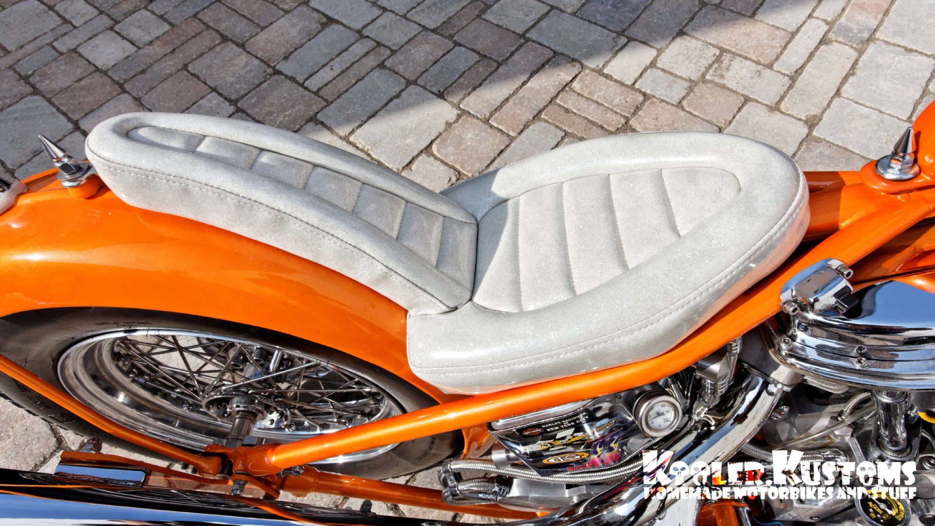 Vorderrad: Yamaha 125, 1972. 88 Kubikzoll Pandemoniumaggregat, Primärriemen, Fusskupplung, Handschaltung. Nen Hammer-Sitz von Blockhead-Leder